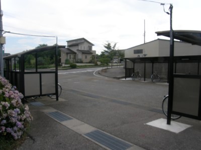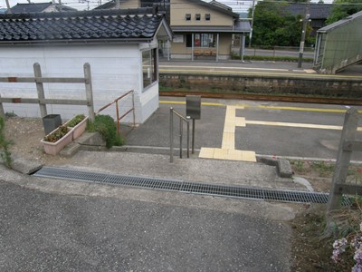下りホーム側にも勝手口のような出入り口があり、自転車置き場などがあります。跨線橋もこちらに通じています。
