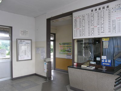 改札の部分は変わった構造です(雪や風の吹き込み防止と思われます)。この駅には駅員はいますが自動券売機はありません。
