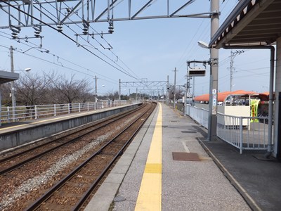相対式2面2線の線路配置で、ホームは緩いカーブの上にあります。