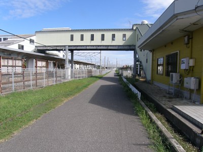 東口と線路の間にはスペースが開いています。かつてはここが北鉄能登線でした。廃線跡はサイクリングロード化されています。