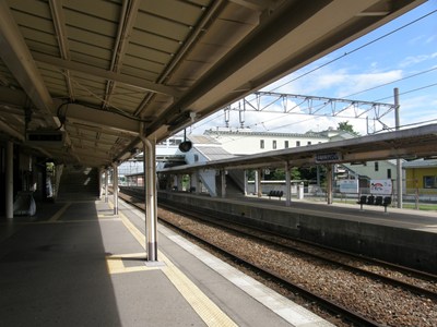 JR型配線と呼ばれる2面3線の線路配置で、駅舎は東西2つあります。もとは北陸鉄道能登線との連絡駅だったので、廃線となった今でもその跡をしのぶことが可能です。