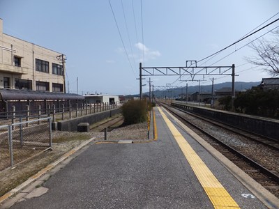 相対式2面2線の線路配置で、コンクリート造の駅舎は下りホーム側にあります。