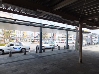 駅舎の前はタクシーやバスの乗り場のあるロータリーとなっていて、屋根があるため雨に濡れずにそれらに乗ることができます。
