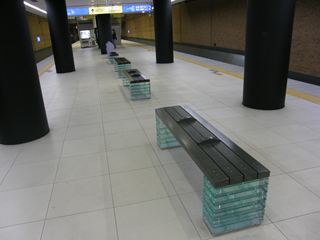 この駅のベンチは、氷の上に木の板を敷いたような黒基調のクールなデザインです。