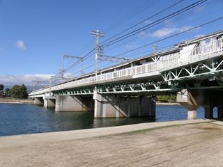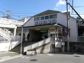 メインの東口は上下線で駅舎が分かれています。駅舎は出入口は堤防の道に面し、駅舎そのものは武庫川河川敷に浮かぶように建っているという特徴的な構造です。また、下り線側の駅舎には鉄橋と併設された歩道につながる出入口もあります。