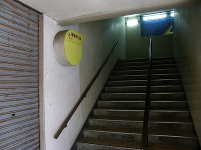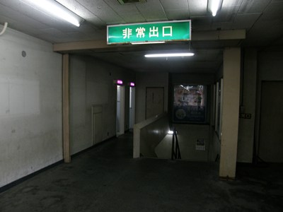 階段とトイレ(左側の入り口2つ)のある辺りはかなり薄暗かった。この階段では3階までしか行けなかった。閉鎖されている側の階段(シャッターの向こう側は見えないが、「非常出口」の表示灯から階段の存在が伺えた)から4階には通じていたのだろうか。