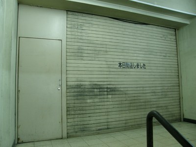 シャッターには「本日閉店しました」という表示。しかし、20世紀末のテナント撤退以来ついに開店することはなかった。