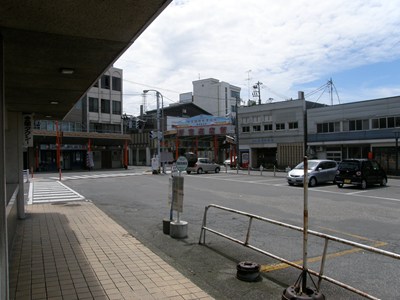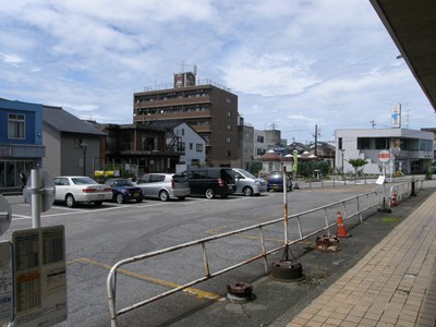 駅前は駐車場やバス停になっていた。駅舎建て替え後は駅舎跡地と合わせて駅前広場として整備されている。駅周辺は古くからの繁華街で、商店などが多くある。