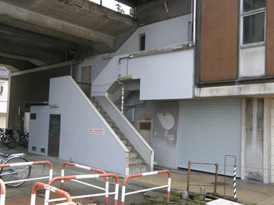 タクシー営業所の反対側にはビルの2階へ通じる階段があった。当初はここからも駅に入れたようだが、少なくとも最末期には階段までしか入れなくなっていた。