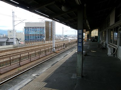 ホームは1面1線で、向こう側の2線はJR北陸線の線路。基本構成は今も変わっていないが、当時はホームが現在より薄暗く、屋根も古さが目立ち、壁面にはたくさんの広告が掲げられていた。