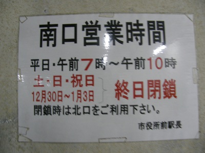 ※7:10〜10:00に変更されたそうです。 南口は営業時間帯以外シャッターで閉じられています。シャッターを切ったのでわかりにくいですが、実は写真を撮るのもきついような暗さです。