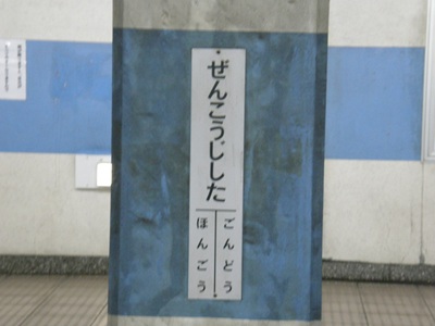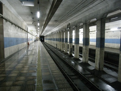 湯田中方より 相対式2面2線のホームで、水色の帯が壁には巻かれています。それにしても、半蔵門線より新しいとは思えない汚れ具合です。