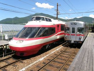 [ 1000系「ゆけむり」 ] 長野電鉄(長野線用) 小田急ロマンスカーといえば日本の民鉄特急を代表するといっても過言ではないほど有名な特急形電車ですが、2006年、そのうちの1つ、10000形HiSEが小田急電鉄から長野電鉄へとやってきました。車両形式は1000系となり車両の長さも元の11両から4両に減らされていますが、連接式の車体の構造や先頭車の展望席は変わっておらず、「ゆけむり」の愛称で現在は長野を代表する特急列車になっています。 外観・内装ともに小田急にいた時代とあまり変わっておらず、長野電鉄では全席自由席のため先頭の展望席にも100円の特急券で乗ることができます。2011年2月12日までは昼間のみのA特急に2編成両方が使用されていましたが、2100系「スノーモンキー」の導入により2月13日からは朝から夜までに運行される時間が増えた代わりに毎日1編成のみが使用されるようになりました。因みに、小田急電鉄に4編成いた10000系の中で長野にやってきたのは2編成のみで、残りの2編成は長野電鉄に2編成が譲渡されてからも小田急で活躍し続けました。(うち1編成はすでに廃車) |