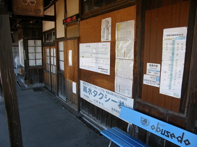 駅舎の中身はほとんど元通り残っているようですが、外側のカギはかけられ、ホーム側は板で塞がれているため立ち入れません。運賃表を見ると木島線が残されているので、少なくとも木島線が廃止される前には駅舎が閉鎖されたようです。