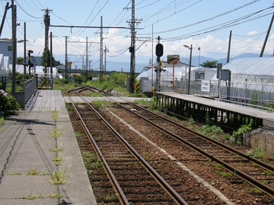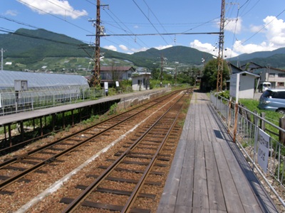 相対式2面2線のホームで、行き違いが可能です。ホームは長野方に延伸されていて、それまでは上下ホーム間に構内踏切があったようです。