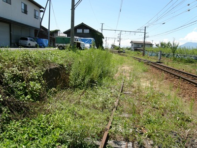 現在でも貨物ホームの段差は残っていて、駐車場に利用されています。草むらの中には線路ものぞいています。
