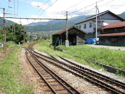湯田中方にも安全側線がありますが、こちらは元は貨物ホームへの引き込み線を兼ねていたようです。現在でも貨物ホームと倉庫が残っています。