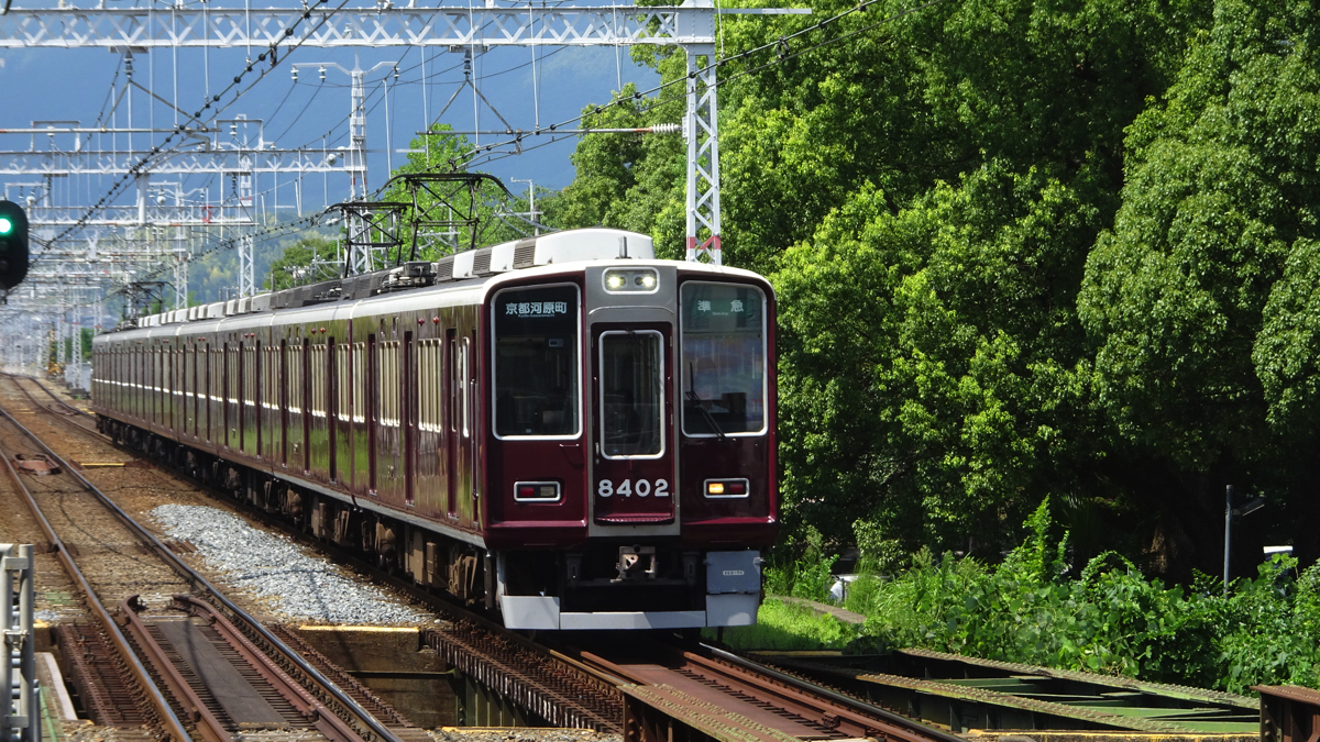 | 8300系 | 1987年の阪急創立80年を記念して導入された神宝線8000系の京都線仕様。堺筋線にも乗り入れる。本形式で採用された「額縁スタイル」の前面デザインは7300系までとは大きく異なり、その後の新車や車体リニューアルのデザインに大きな影響を与えた。 |