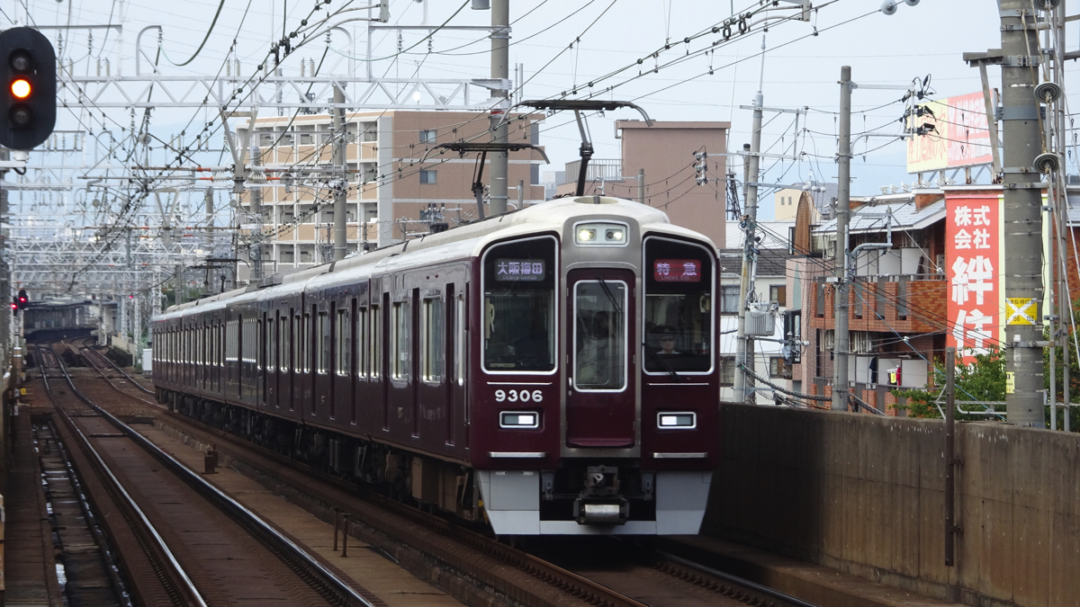 | 9300系 | 阪急の標準車両として導入された車両で、特急車両として導入された。同時期に導入された神宝線用の通勤型車両9000系と共通設計で、屋根にエアコンキセを隠すためのカバーが取り付けられているのが特徴的。2300系により置き換えられて順次ロングシート化が進められる予定で、ロングシート化された編成は千里線にも乗り入れる。 |