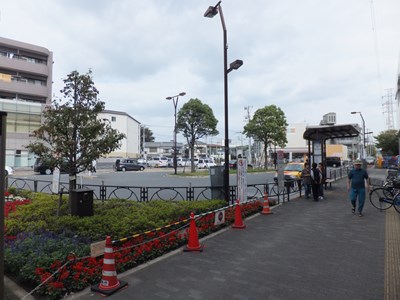 駅の北側には駅前ロータリーがあり、バスやタクシーの乗り場になっている。また、駅の1階はスーパーマーケットになっている。