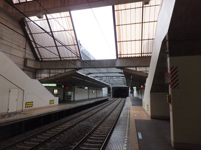 ホームの中央部は駅舎に覆われており、地下駅のような雰囲気が漂っている。