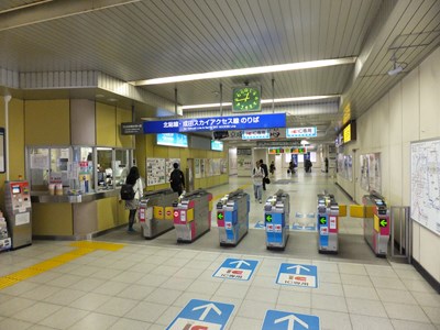 京成との共同利用駅である当駅の改札には「成田スカイアクセス線」の表記がある。