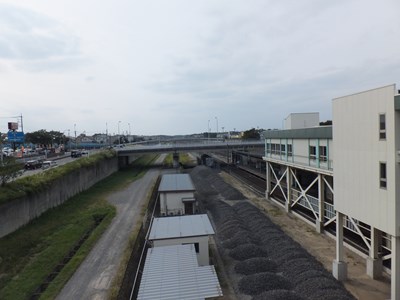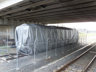 駅西側の道路橋の下には銀色のビニールシートに覆われた物体がひっそりと置いてある。実はこれは北総鉄道が開業時に導入した7000形のトップナンバー
