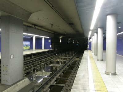 相対式2面2線の線路配置で、壁などは濃い青に塗られています。