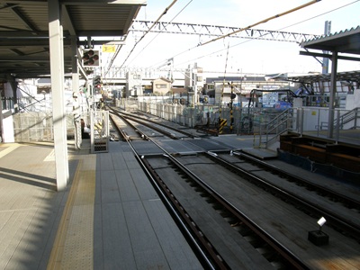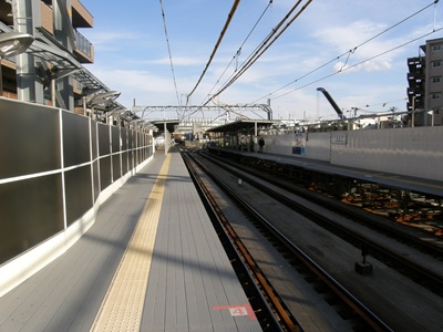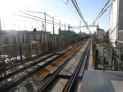 ホームは工事中だけの仮設のものが使われています。また、線路も工事中は下で作業を行うのでバラスト敷きでない仮設の路盤です。