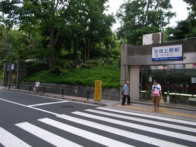 駅の正面口は駅の東側にあり、中央通りに面しています。駅のある付近では上野公園が大地になっており、その法面を駅出入口にしています。正面は成田空港への利便性をアピールする宣伝になっており、スカイアクセス開業の際に内容が変更されました。
