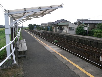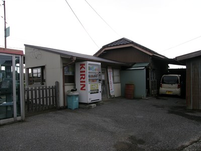 1階建ての小さな駅舎で、奥の寄棟の建物が駅事務室、手前の片流れ屋根の建物が待合室として使用されています。