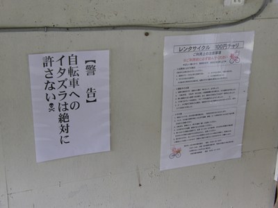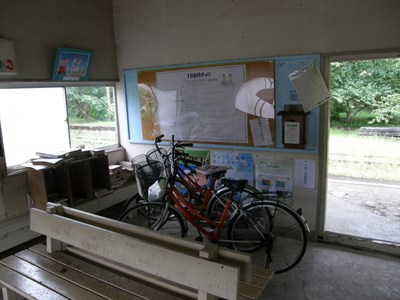 待合室内にはレンタサイクルが置かれています。100円の利用料ですが、盗難やいたずらが多いようです。