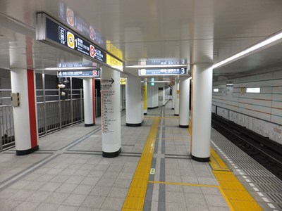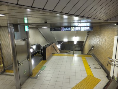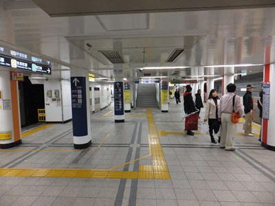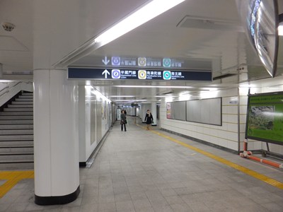 11番出入口の側のコンコースは10番出入口側とはつながっておらず、こちらはホームの下にあります(乗客は一旦余計に下った後ホームまで登る)。