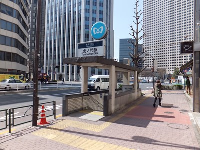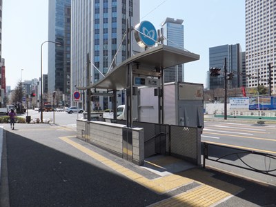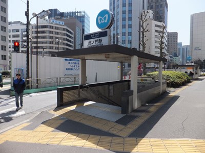 7番出入口は駅の西側、虎ノ門交差点の北東にある出入口です。2005年に、道路を走行していたトレーラーに積まれた重機に接触し、屋根が大破するという事故が発生したため、この出入口だけ屋根が新しくなっています。