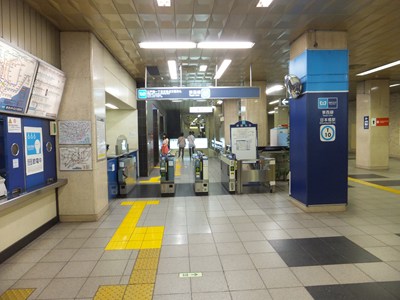 左から順に江戸橋方面改札、コンコースより浅草線方面、改札より浅草線方面
