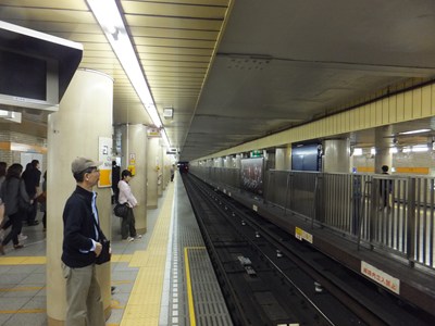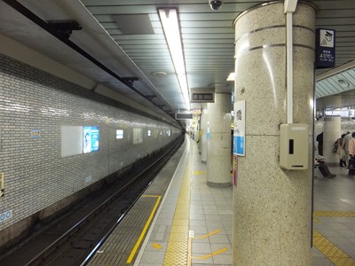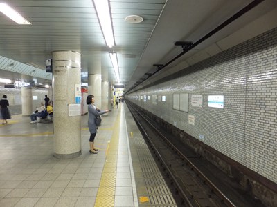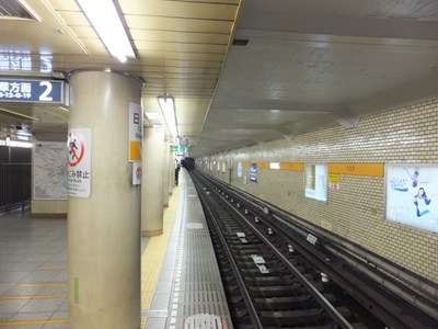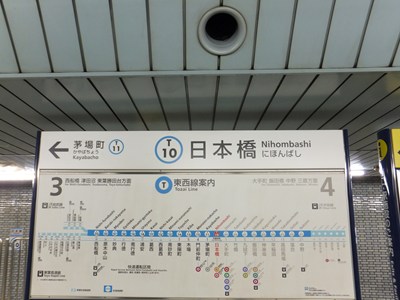 日本橋駅のプラットホーム・駅名標のご紹介。銀座線ホームは中央通り、東西線ホームは永代通りの地下にあります。