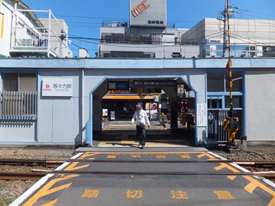 駅舎は上下線で挟まれた狭いスペースにあり、南北から踏切で出入りします。九品仏駅と違い、出入り口を挟んでホームと反対側に駅舎があります。