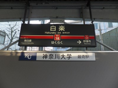 白楽駅は東急東横線の駅です。白楽という地名はかつて神奈川宿の伯楽(ばくろう:馬の仲買人)が周囲に多く住んでいたことが由来とされ,東京都内 にある馬喰町と同源の地名です。