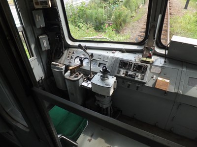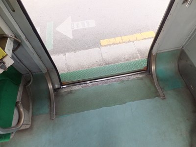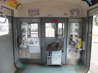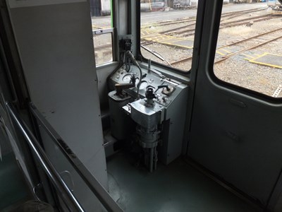 もう片方の車端部はあとから設置された貫通型の運転台です。こちらの乗務員室には乗務員専用の扉がなく、そのためか大きな出入り扉が設けられています。