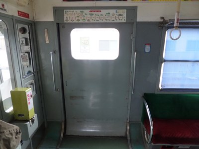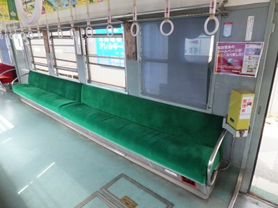 座席は全てロングシートです。座席端のパイプや吊り手の形が時代を感じさせます。また、元々の色が何色かはわかりませんが、モケットは赤色と緑色が混合