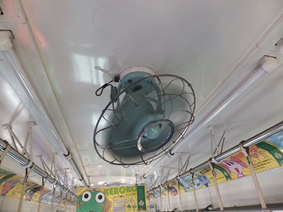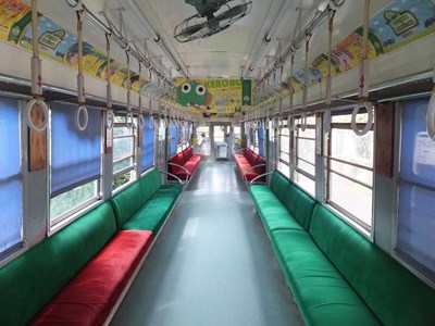 屋根のつるつる具合を見れば分かる通り、5000形は非冷房車です。そのため、夏場は200形がその運用を代走することも多く、運用に入るときにはすべての窓が開けられ、扇風機もフル稼働します。