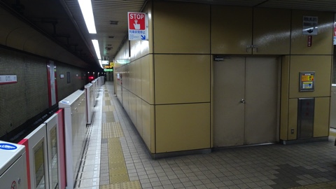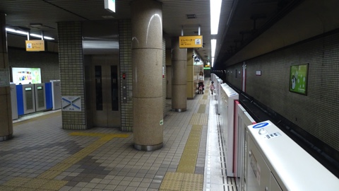 柱は薄茶色。非常用渡り線があり、折返し可能駅。