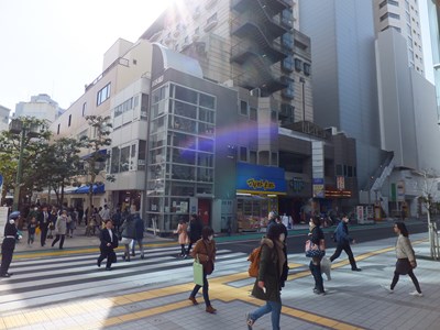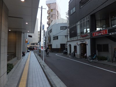 鷹匠口は裏口にあたる出入口で、駅の周辺は雑居ビルが立ち並ぶ地域である。
