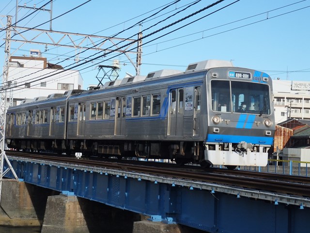 1000形の塗装は今や全く規則性が無くなっており、この編成はオリジナル塗装を踏襲しつつも青主体となり、側面にも帯が入っている。なお、1000形は