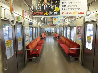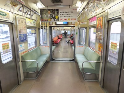 座席は8人掛けのロングシートで、モケットはえんじ色である。網棚は向かい合わせ一組のうち片側の、さらに3分の2くらいにしか設置されておらず、利用距