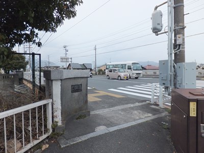 駅は線路と県道が近接した部分にあり、さらに両者の間には高低差がある。そのため駅舎に接続する歩道は車道とは大きな高低差がついている。駅前の歩道は狭