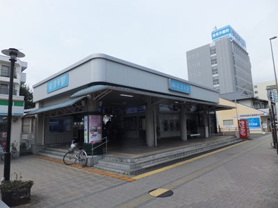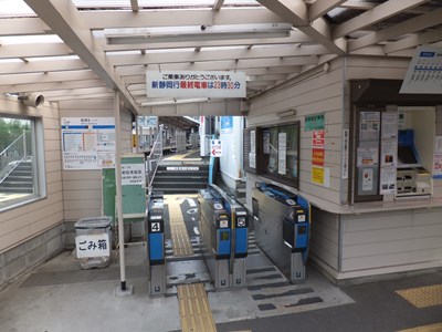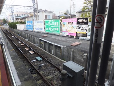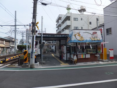 巴町口の改札と駅事務室は道路からは少し奥まったところにある。上写真に見える駅入口の建物は駅前で営業しているたこ焼き・タイ焼きの店である。