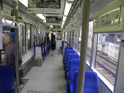 車内はロングシートとクロスシートを組み合わせた都電で標準の座席配置です。