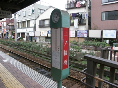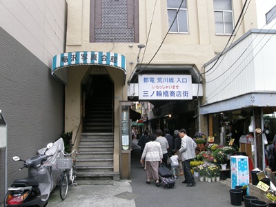 王電ビルを通り抜けると小さな道があり、そこを渡ると都電荒川線の三ノ輪橋駅です。門に絡まったツタがいい雰囲気になっています。