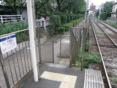 三ノ輪橋方面ホームは水道局の施設に沿って作られた遊歩道に隣接した位置にあり、スロープとは反対側にも出入口が設けられています。